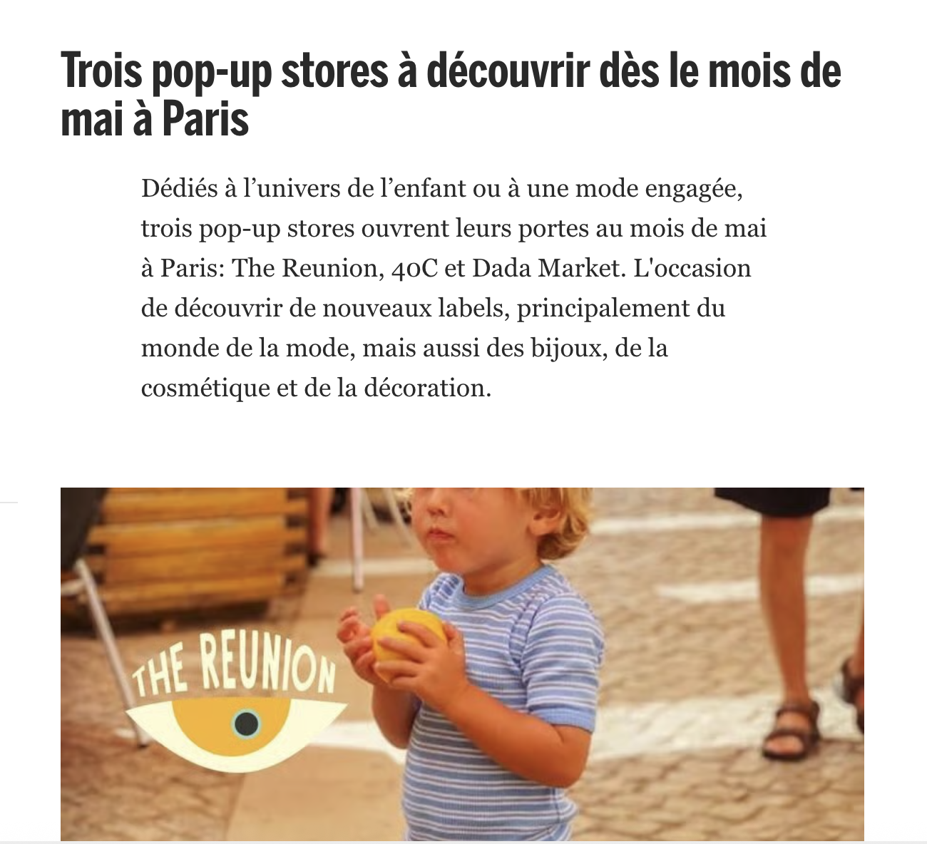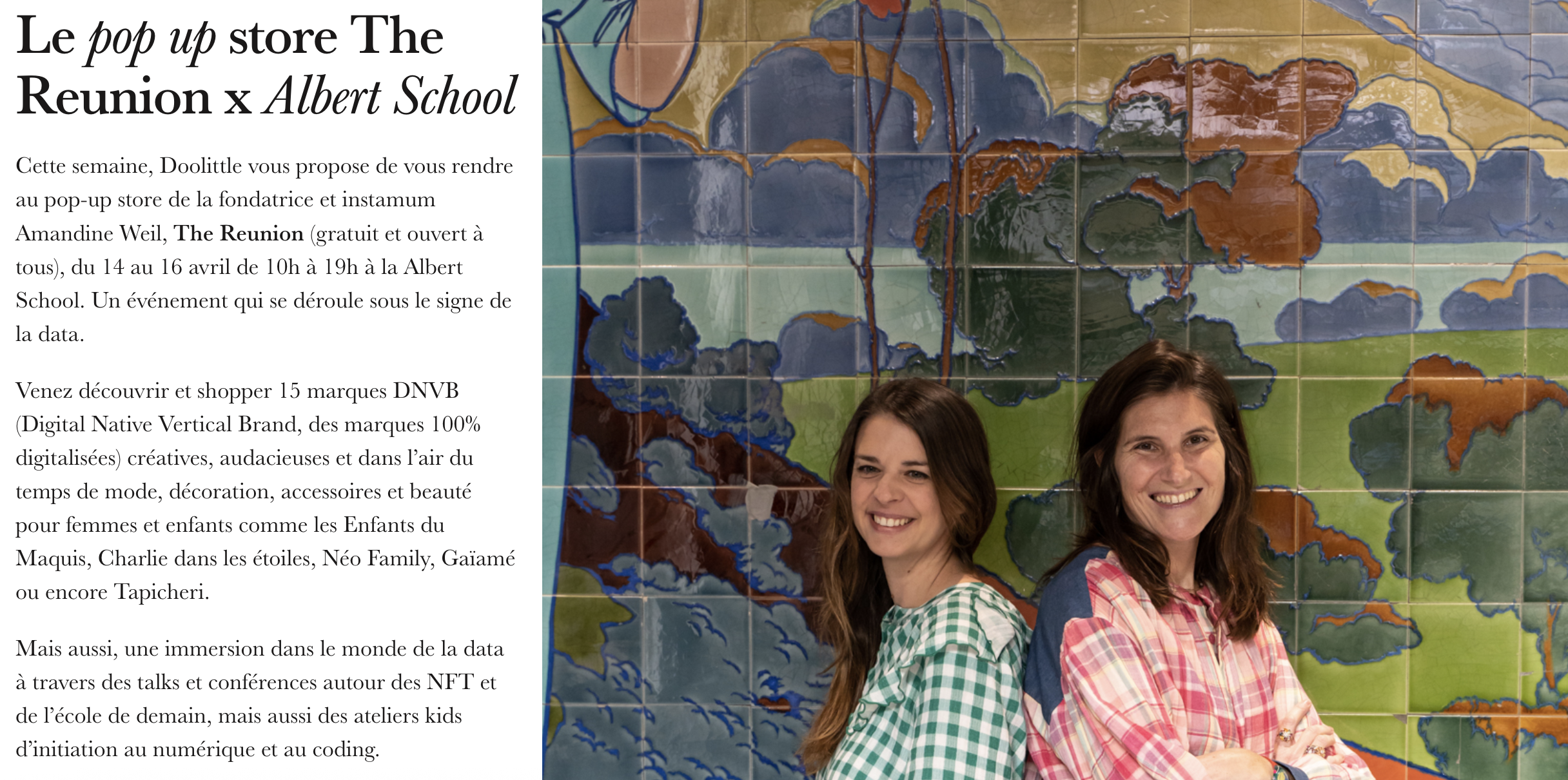 Cette activité a donné lieu à la création des pop-up store THE REUNION : Une CURATION pointue de marques niches autour de thématiques variées (Holistic Wellness, Cosmic, La Parisienne, Le Bonheur, Artisanat et Voyage, les Sports d’hiver etc..), toujours accompagnée d’EXPERIENCES permettant de nourrir la thématique, dans des LIEUX de caractère et exceptionnels habituellement inaccessibles.
